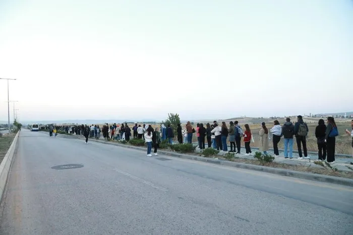 İnci Kara: O sıranın ilk başlarında ben vardım, burası Çubuk KYK. Okula gitmek için saat 04.30’da uyanıp 2,5 saat yol çektik ve bu böyle devam ediyor. Günlük 5 saatimiz yolda geçiyor, derslere verimli katılım sağlanmasının imkanı yok bile.