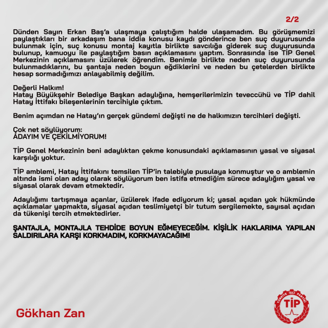Türkiye İşçi Partisi’nin sürpriz bir kararla adaylığını geri çektiği TİP Hatay Büyükşehir Belediye Başkan Adayı Gökhan Zan yeni bir açıklamada bulundu. İlk açıklamasında “Yoluma ve adaylığıma halkımla birlikte daha azimli ve güçlü bir şekilde devam edeceğim.” diyen Zan, son açıklamasında şantajlara maruz kaldığını belirterek partisi hakkında “Benimle birlikte neden suç duyurusunda bulunmadıklarını, bu şantaja neden boyun eğdiklerini ve neden bu çetelerden birlikte hesap sormadığımızı anlayabilmiş değilim.” ifadelerini kullandı.